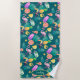 Fun tropical images make a colorful pattern on this cute beach towel. Images include a toucan bird, a pink flamingo, an ice cream cone, ice cream bars, a bright grapefruit slice, and a lemon, all surrounded by bold stars and green palm leaves. The multi colored, bright images are placed on a dark teal background, and repeated across the surface of the towel. At the bottom is a matching teal oval with your name, monogram, or other custom text.