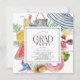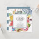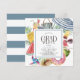 This cute grad/graduation party invitation features a white background with a beach umbrella, flip flops, tropical mason-jar drink/cocktail, popsicle, watermelon, donut, pineapple, straw hat, fresh coconut drink, pinwheel and sunglasses. The reverse side features a white background with blue stripes. Perfect for a summer graduation party on the beach or at the pool side! Personalize it for your needs. You can find more matching products at my store.