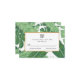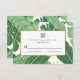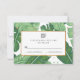 A modern wedding RSVP features illustrations of banana leaves and faux foil.