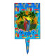 Tropical and colorful ocean sunset behind surfboards, palm trees, a macaw parrot perched on the surf boards, and hibiscus flowers at the bottom. Background pattern of retro surfboards.