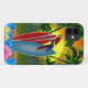 Tropical and colorful ocean sunset behind surfboards, palm trees, a macaw parrot perched on the surf boards, and hibiscus flowers at the bottom.