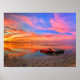 A brilliant tropical sunset with bright hues of orange and pink in a blue sky. The magnificent sunlight colors reflect upon the still ocean water. A small row boat and deck are sitting next to the soft sandy beach.