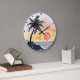 This artistic wall clock showcases a serene tropical scene with a graceful palm tree silhouetted against a vibrant sunset over the ocean. Its decorative and colorful design, with a relaxing vibe, makes it ideal home décor. This nature-inspired timepiece captures a tranquil beach view, bringing a touch of summer vibes and coastal theme to any room.