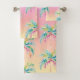 This island style bath towel set will be so inviting after your day at the ocean or pool. Tropical shades of an island sunset is a summer staple. Add a colorful palm tree and it becomes the most beautiful beachy bathroom accent. Multicolor soft water color pastels.