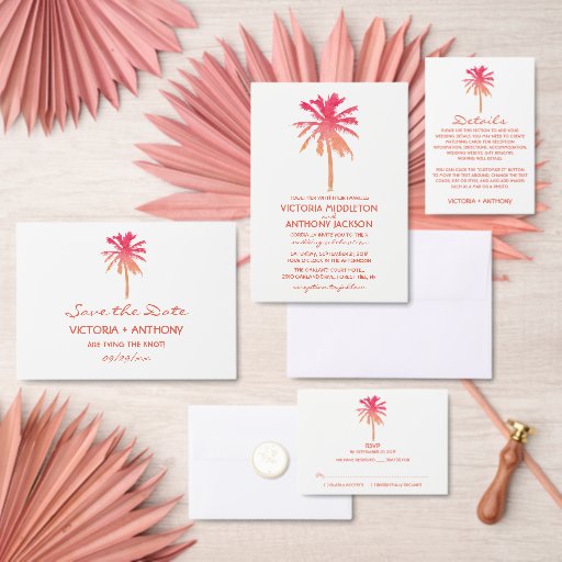 The design features a tropical watercolor palm tree in shades of warm coral pink, red and orange on a clean white background with color coordinated editable wording.