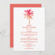 The design features a tropical watercolor palm tree in shades of warm coral pink, red and orange on a clean white background with color coordinated editable wording.