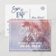 This tropical sunset save the date postcard is perfect for a destination or beach wedding. The design features a stunning pink, purple and blue watercolor sunset complete with a palm tree blowing in the breeze.