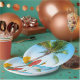 This design features colourful surfboards standing up in the sand with a palm tree, beach and ocean in the background.