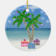 The Backs of these Beach Themed Christmas Ornaments have a Palm Tree with beautiful Ornaments adorning it with presents under the Palm Tree. Snow Flakes are falling from the sky to remind you that you are in warm and sunny Florida.