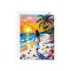 A sweet postcard letting a friend know you are thinking about them and checking in. The front has a beautiful ai illustration done in an oil painting impasto style. A woman walking on the beach among palm trees, tropical flowers, turquoise waves, sea glass and seashells.