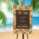 Tiki party theme foam board sign features a rustic wood sign in the center with "Tiki Time" typography, the couples' names, event date, and an Aloha greeting with a border of Tiki masks, pineapples, hibiscus flowers and palm and monstera leaves. Perfect for tropical, beach & Hawaiian theme baby showers, wedding showers and anniversary celebrations. Art by KL Stock.