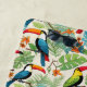 Colorful toucans nestled among lush tropical leaves and florals create a lively jungle pattern in vibrant greens, blues, and warm accents. Ideal for apparel, accessories, and tropical décor.