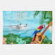 Digital artwork of a tropical beach with a macaw parrot perched on a guitar and a Albatross seaplane in the bay.
