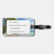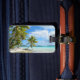Luggage tag with a tropical image of a hanging palm tree on a white sand beach of a pacific island. Great for a tropical travel vacation. The name on the tag is easily customizable.