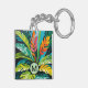 This design captures the lush beauty of tropical foliage in a bold, stylized manner. The composition features a striking arrangement of diverse plant leaves, including broad monstera leaves, slender palm fronds, and vivid heliconia. The color palette is rich and eye-catching, with shades of green ranging from lime to emerald, accented by bright oranges, yellows, and pinks. Personalize with an initial.