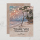 Vintage beach destination thank you cards featuring a romantic sunset tropical beach setting with lush palm trees and string twinkle lights.