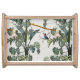 Tropical vintage botanical landscape, palm tree, banana tree, plant, Lilac breasted Roller bird, floral seamless border background. Exotic green blue jungle wallpaper or banner.
