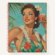 A glamorous woman in a floral dress and Hawaiian lei enjoys a cocktail under palm trees, radiating retro island charm and vacation bliss.