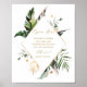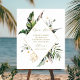 This wedding open bar sign features watercolor green tropical foliage, palm tree leaves, banana leaves, and faux gold leaves with a faux gold diamond shape frame. It's perfect for a tropical, beach, or destination wedding.