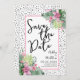 A tropical design that embraces the tranquil beauty of nature mixed with a playful edge that is sure to help you have fun. A blend of calming green tropical leaves, including banana leaves, palms, monstera leaves, and pink princessa plants, alongside soothing purple-pink orchid flowers and protea bloom, intertwined with various other foliage. Adding an element of fun, a black 'messy dot' or 'dalmatian dot' background infuses the design with a playful touch. Enhanced by a modern handwritten font, this enchanting print radiates charm and sophistication. This versatile design brings a sense of tropical paradise to any setting or special occasion, making it perfect for a destination wedding, or just when you want to add a tropical flare. Colorful Floral Palm Watercolor Tropical Wedding Save the Date