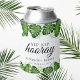 A fun tropical-themed can cooler with green palm and monstera leaves. Features “Sip Sip Hooray” in elegant script, perfect for wedding celebrations. Customizable with names and date. Tropical Jungle theme Monstera or Palm leaves Sip Sip Hooray custom wedding can cooler. Designed and illustrated with love by Kristine Lee Designs www.kristineleedesigns.com