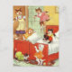 Cute vintage artwork showing several kittens in clothes jumping on a bed and tossing pillows.
