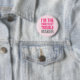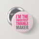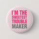 Funny button for bad girls with typography design featuring a funny slogan on pink and grey reading "I'm the sweetest trouble maker". Irresistible excuse (or warning) in case of trouble!