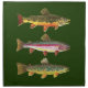 3 TROUT - Brook Trout, salvelinus fontinalis; Rainbow Trout, oncorhynchus mykiss; and, Brown Trout, salmo trutta. A design for those who love fishing for these beautiful fish. Art is from original watercolor paintings by Mr. Trout Whiskers. For any angler's house, cabin, lodge, office, parties, anywhere! Makes a great gift anytime of the year!