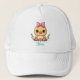 A beautiful and cute yellow duck with a pink ribbon on its head and sitting on white and pink flowers