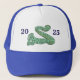 For men's and women`s Trucker Hat 2025 with a unique snake print. It features an animated great green snake with yellow irregular-shaped spots that add uniqueness and a mystical power to the design. The Trucker Hat 2025 includes the text: " 2025".