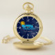 Image of the blue heavy long-haul truck against the background of setting sun, the blue text TRUCKER serves as a roadway. White stylized customizable name text John Mitchel under the image. Dark blue background, white clock face. Funny customizable pocket watches for a brave truck driver. You can change the name. Good as a gift.