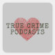 A square sticker for true crime podcast lovers everywhere, featuring a red fingerprint heart with typewriter style text.