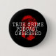 A pinback button for true crime podcast lovers everywhere, featuring a bloody fingerprint with typewriter style "True Crime Podcast Obsessed" text.