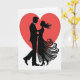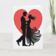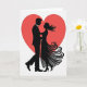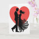 This design shows a large red heart behind a couple, like a glowing backdrop that frames them ❤️. The man and woman are shown in black silhouette, facing each other and holding close as if they’re about to dance. He wears a suit with a bow tie, and his head is tilted toward her in a steady, caring way. Her hair curls in long, flowing swirls, and her full gown fans out with curving lines that suggest movement. The background is white, so the dark figures and the red heart stand out clearly and keep the focus on their connection. There isn’t any text on the front, which makes the image feel simple and direct, leaving room for your own words inside 🥰. It feels meaningful to give because it captures that quiet moment when two people choose each other and lean in close. Share it to pass along