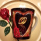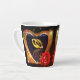 Beautiful latte mug with a printed image of an acrylic painting of two gold wedding rings inside a gold shaped heart with a red rose.