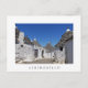 Postcard with traditional white plaster trulli houses with stone tiles in conical roofs in a small street in the town Alberobello, Itria Valley in Puglia, Italy with a white border and the text: 'Alberobello'.