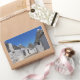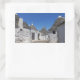 Rectangular photo sticker with traditional white plaster trulli houses with stone tiles in conical roofs in a small street in the town Alberobello, Itria Valley in Puglia, Italy.