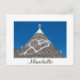 Postcard of a close-up of a stone tile roof of a traditional trulli house with a heart painted on it in white paint in the town of Alberobello, Puglia, Italy with a white border and the text: 'Alberobello'.