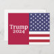 This Donald Trump 2024 presidential campaign postcard has a red background and the title "Trump 2024" printed in white font. The right portion features an image of the American flag.