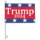 This Donald Trump presidential campaign car flag features a solid red background in the center with the name "Trump" and election year "2024" printed in a white, regal font. The background borders feature white stars over a dark blue background to represent the American flag.