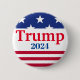 This patriotic, American flag style campaign button features the phrase "Trump 2024" with the election year "2024" printed in blue and the name "Trump" enlarged and printed in red. A band of white stars over a dark blue background appear above the slogan and a band of red and white stripes appear below the slogan. The patterns and colors on the button represent the American flag.