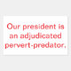 Our president is an adjudicated pervert-predator. Comic Conscious-Social-Commentary Splash-Art sticker-design by Jeff Hankamer at Artjunkhaus