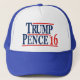Buy a red white and blue Trump Pence 2016 campaign trucker cap and support Donald Trump for president! Featuring the words, Trump and Pence in a bold blue text, '16 in red, centered on the front of the hat. Choose from different hat colors and get yours today.