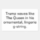 Trump waves like The Queen in his ornamental lingerie g-string . Comic Conscious-Social-Commentary Splash-art sticker-design by Jeff Hankamer at Artjunkhaus