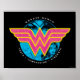 Wonder Woman | Pink and yellow Wonder Woman logo over a blue comic book collage disk, encircled with her name and the words "Truth. Compassion. Strength".