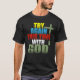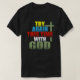 This black t shirt features a colorful graphic with the text "TRY AGAIN THIS TIME WITH GOD". Each word is presented in a different color: yellow, blue, red, and green. A light blue cross is incorporated into the design.