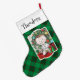 Perfect! Exactly what I ordered! I uploaded a picture of my blue chow, and the screen print was incredible. the back side of the stocking was the red and black checkered print. my puppy's name was also printed on the cuff of the stocking. PERFECT! Highly recommend this product! My puppy's name was screen printed onto the cuff of the stocking, the font was perfect!
