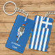 Greek Evzone guard (tsolias) icon holding a gun, wearing red fez, fustanella and tsarouchia. Custom background color. Custom text. Flag of Greece at back side.