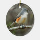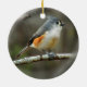 This Christmas ornament features an original photo of a tiny Tufted Titmouse on the branch of a Peach Tree.