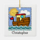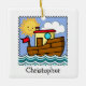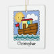 Cute brown cartoon tug boat with a cream colored cabin and a little red flag on the back. It is sailing on the blue waves on a cloudy but sunny day. Below is a template to add your name to personalize.